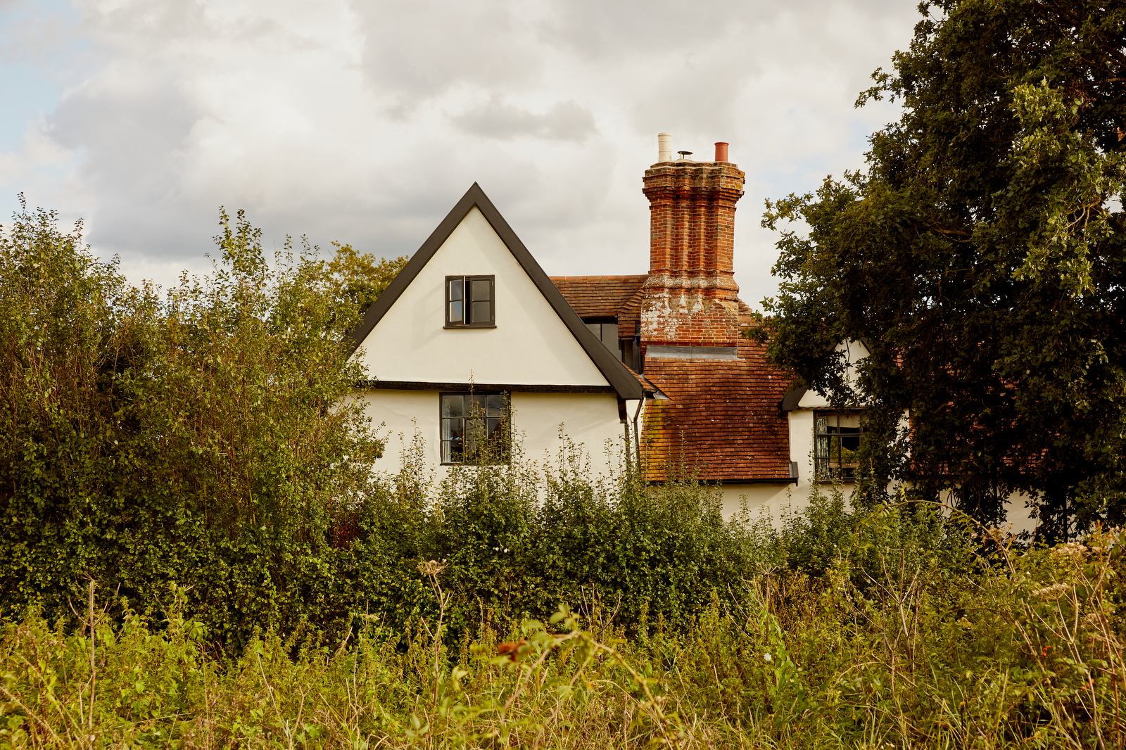 A gate in the front hedge swings open to the garden, with a path running past ponds, fragrant honeysuckle and a mature oak tree to the entrance of the house. The timber door, painted in ‘Baked Cherry’ by Little Greene, sits proudly amidst the white, lime-rendered façade and opens to the centrally positioned kitchen and dining room around which the ground floor living spaces are arranged.